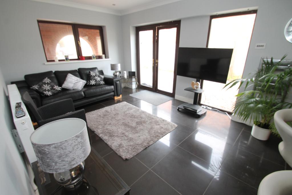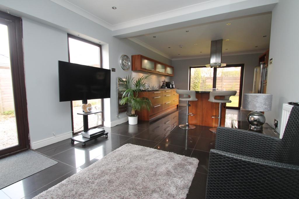 The property features a converted garage space, perfect for a playroom or home office, as well as a utility room and downstairs wc/cloaks for added convenience. The large open plan living room flows seamlessly into the dining area, while the modern fitted kitchen overlooks a spacious sitting/breakfast area. The kitchen is beautifully finished, perfect for family meals and entertaining guests.