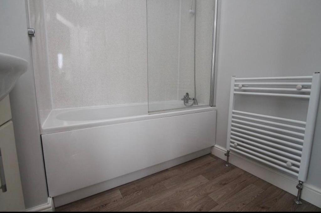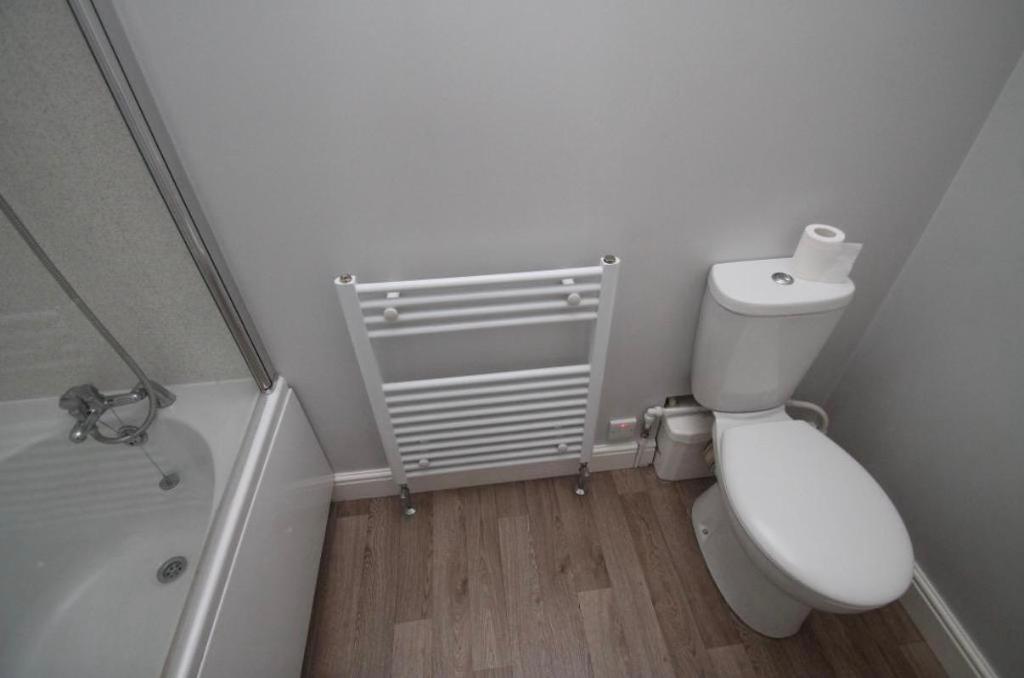 Modern bathroom suite, bath with shower over, towel rail and WC and wash hand basin.